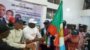 Rt. Hon. Dr. Caleb Onyema Ani receives the APC flag from the Enugu State APC Caretaker Committee Chairman, Dr. Ben Nwoye, during the flag-off of the party’s electronic membership registration exercise in Enugu South Local Government Area.